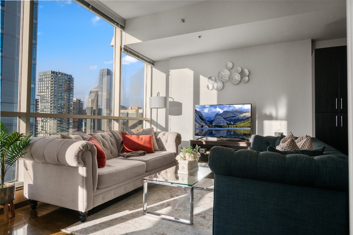 This stylish suite has features floor to ceiling glass windows, breathtaking city views, two bedrooms, king bed, comfy living area, a dedicated work space, UG parking, high speed internet and more.
