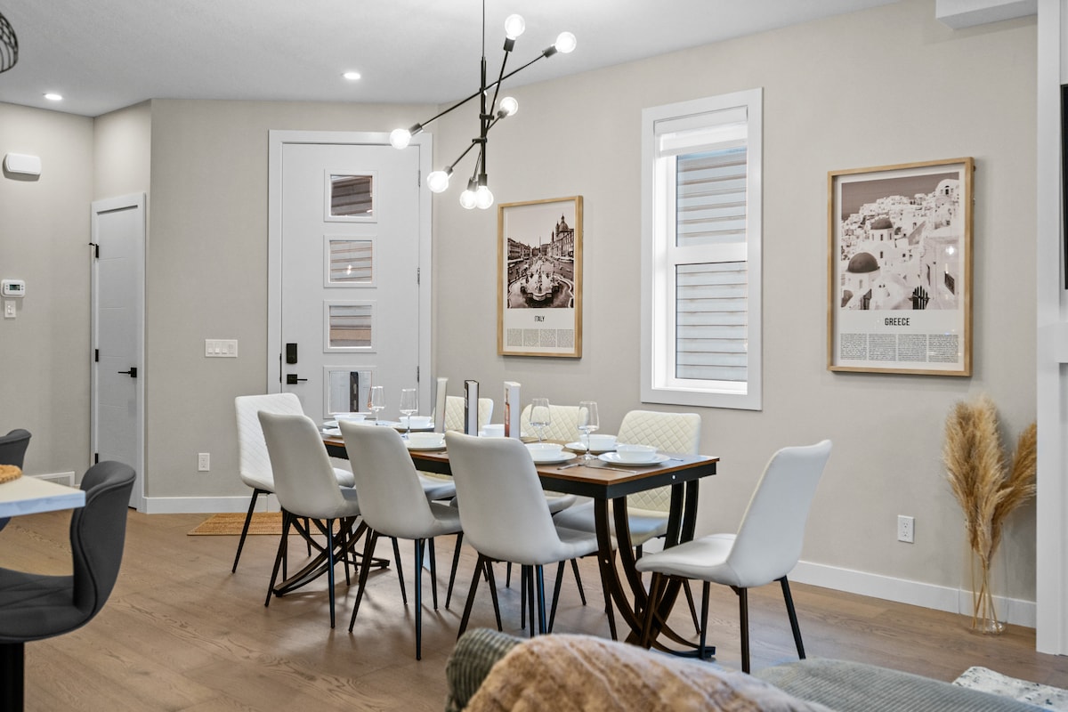 Indulge in a luxurious 4-bedroom, 3.5-bath NW Calgary retreat, featuring two king beds and a spa-like master bath. Relax with a private garage, vibrant game room, fully equipped kitchen, and FREE Netflix on a smart TV.